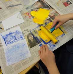 Introduction of mono printing to the children of class 0, 1 and 2 at the Hiirola school. Writing the name of the backside of the printing paper, rolling the printing plate with ink put the paper on the plate. Make a drawing on the backside and the result is a print on the front. |